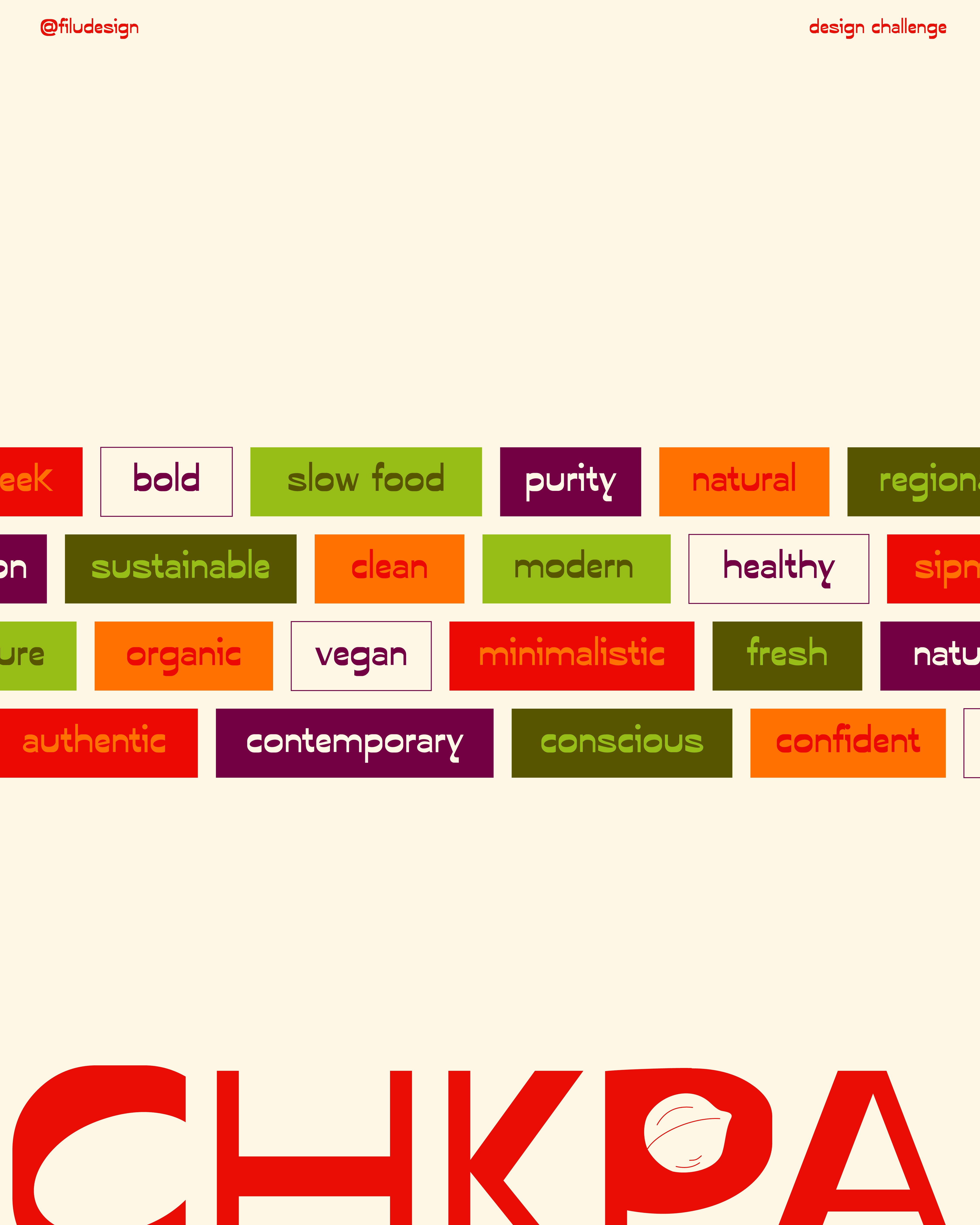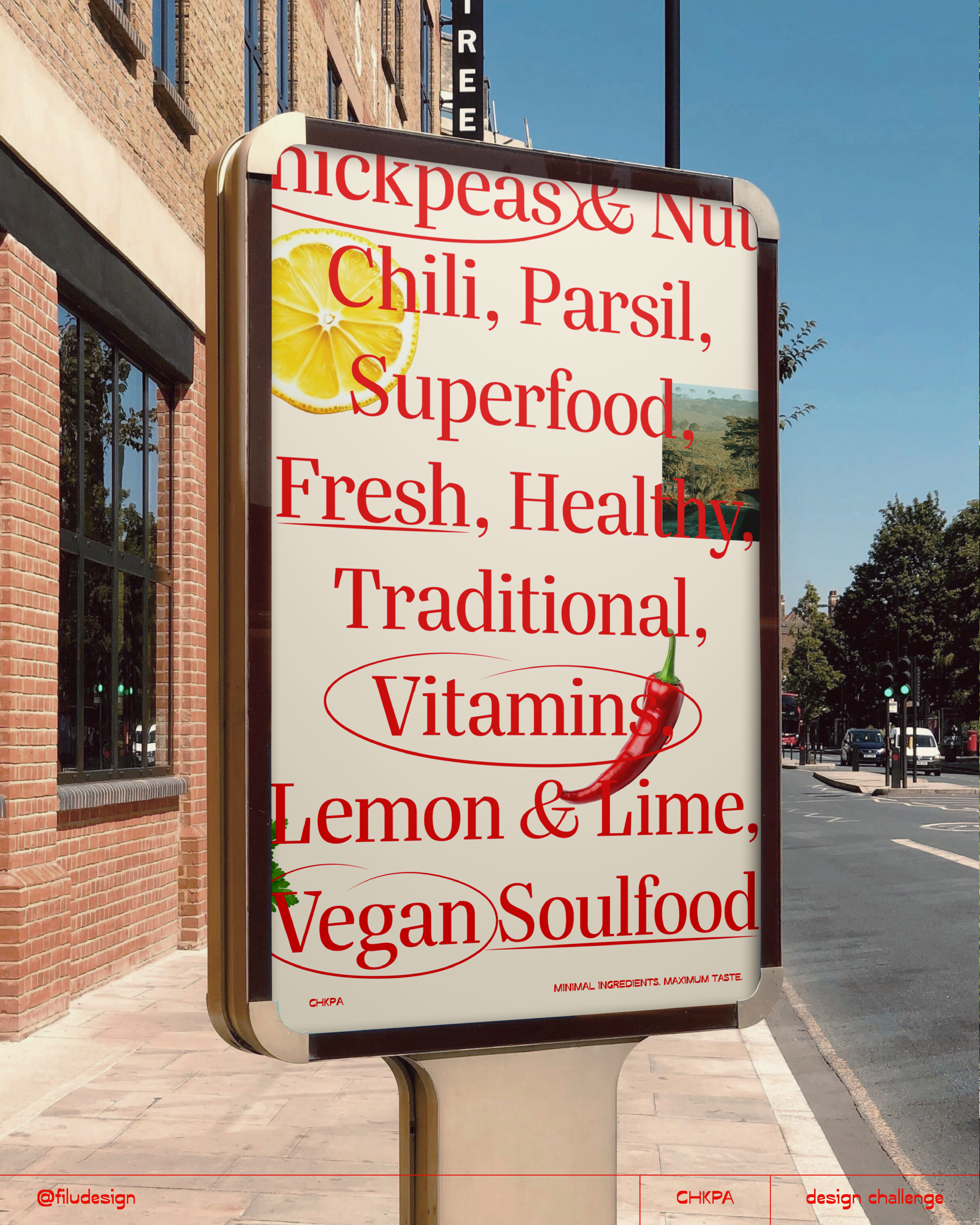 For this health-focused brand I decided to stick to a fresh and modern design. It’s all about minimalism and a super clean look as CHKPA stands for natural ingredients, a healthy lifestyle and unprocessed food. Loving to play with the layouts and lines in this concept, I wanted to keep this design as straight forward as possible. Additionally, I created multiple possible hummus flavors, their packaging and some street marketing concepts with billboard and poster designs.