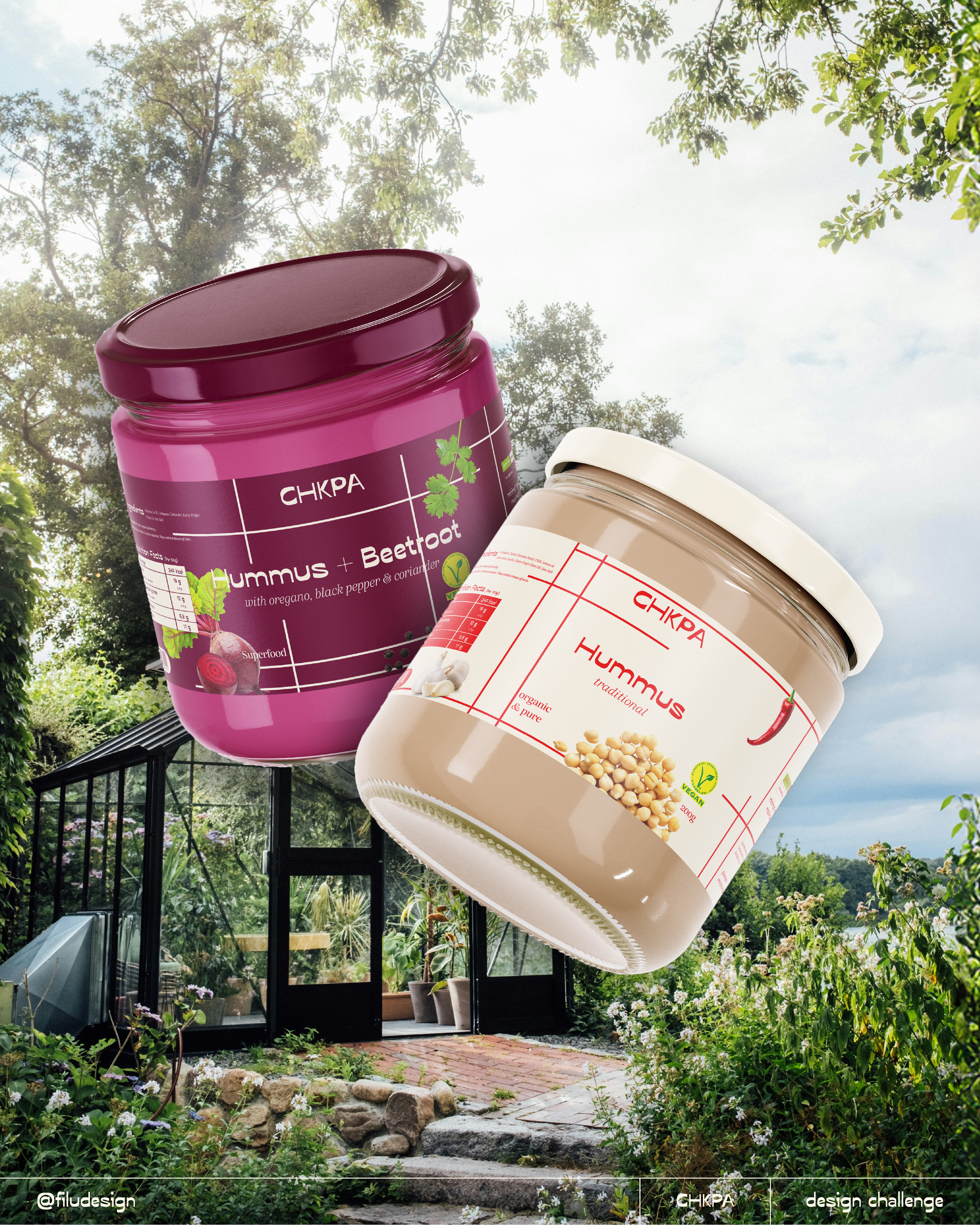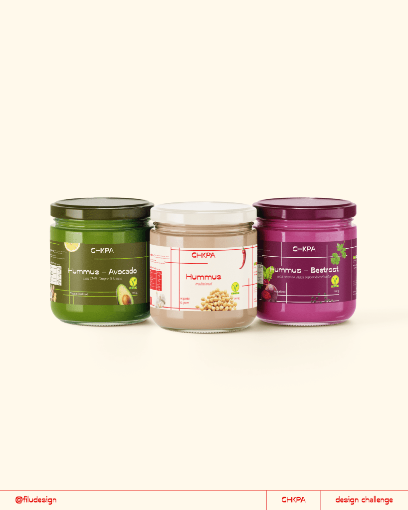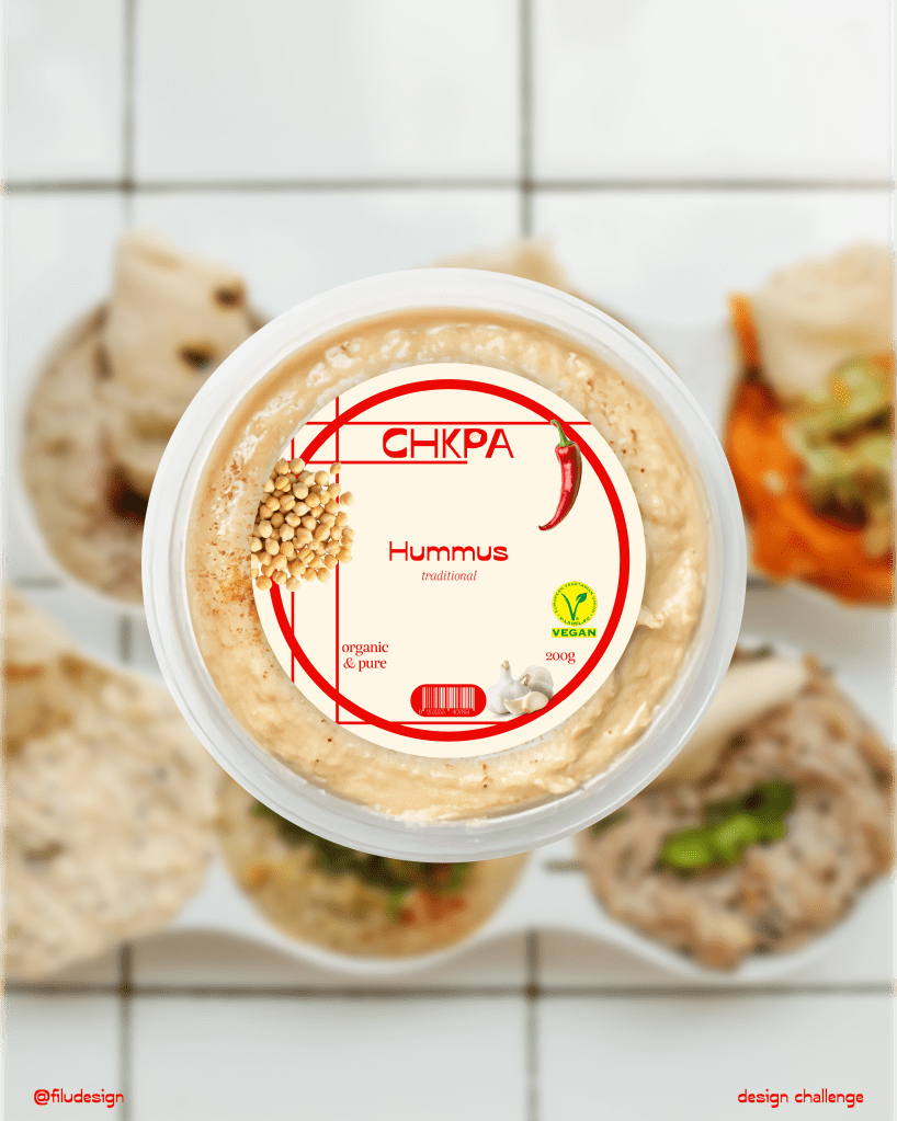 As part of a social media design challenge in July 2025, the hummus brand CHKPA required full branding and packaging design for their classic hummus. Brand Identity and any extra deliverables were up to the designer.