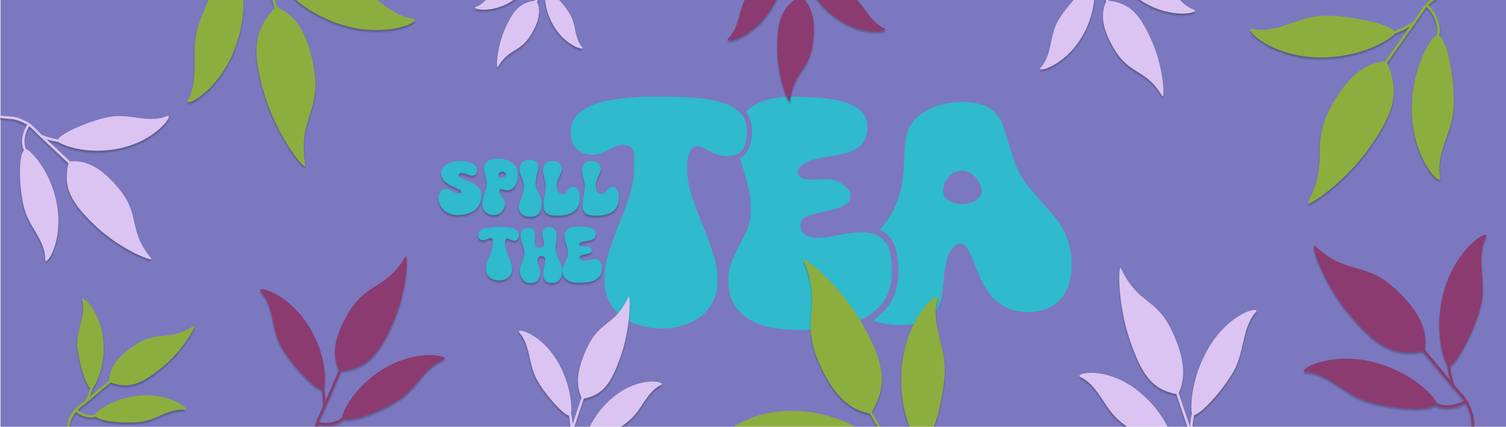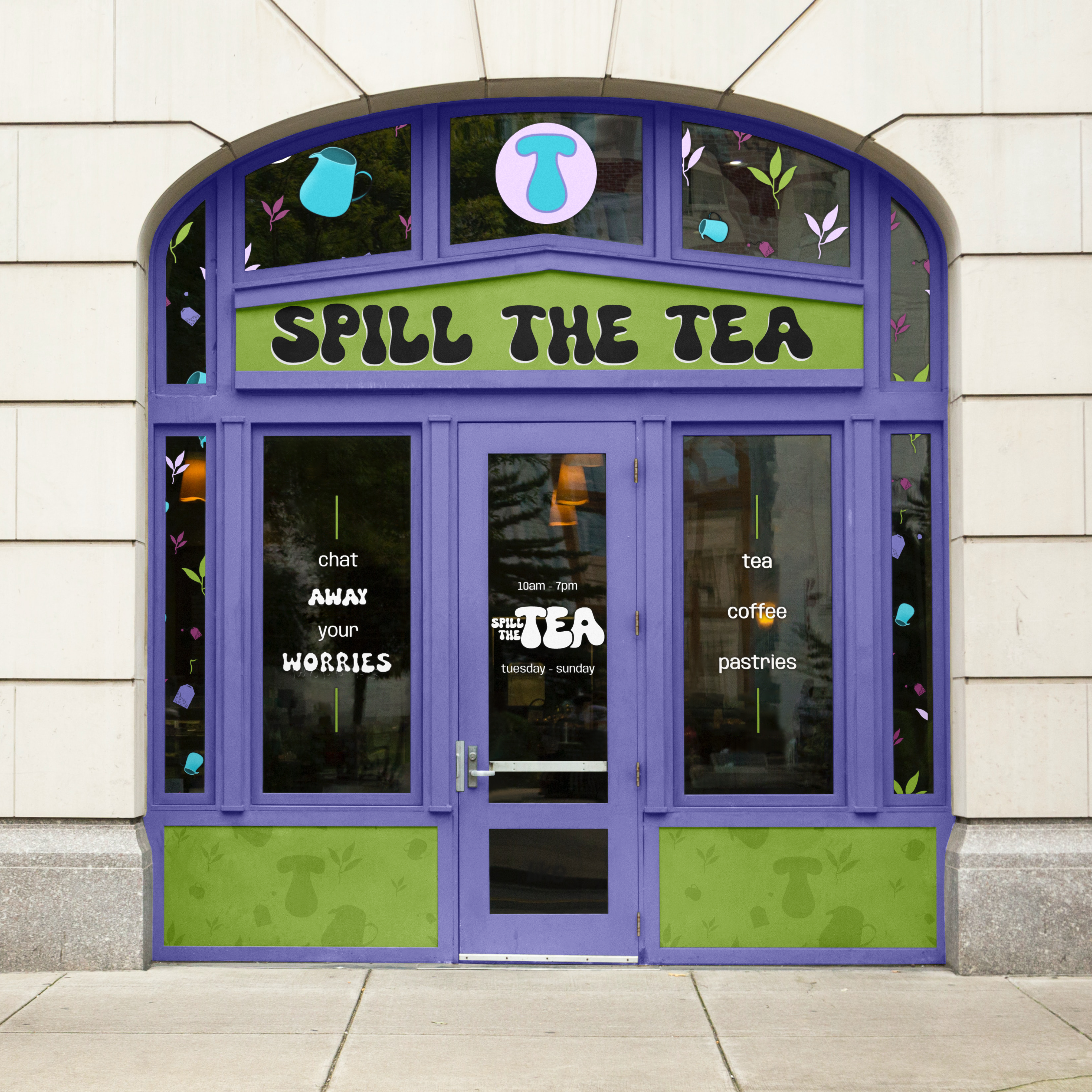 “Spill the Tea” is a modern café/tea bar that feels like a safe space for young people. The design should be colorful yet calming, with a palette of green, turquoise and purple/rosé shades to evoke a sense of comfort and joy. The branding should feel fresh, trendy, and inviting, featuring mockups for menus, store fronts, and social media posts that communicate a relaxed, cozy atmosphere where people can unwind, connect, and “spill the tea.”